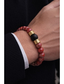 Pulsera de hombre muy bonita hecha con mimo en nuestros talleres de Francia. Esta pulsera está hecha de hermosas cuentas de jaspe imperial rojo natural, cuentas de ágata negra y cuentas tibetanas muy bonitas en latón dorado. Es la fuerza del metal lo que brilla en este modelo. Estilo: Étnico, Bohemio, Tribal, Zen Longitud: 210 mm Cuentas: 10 mm y 12 mm Materiales: Jaspe Imperial (Piedra Semipreciosa), Ágata Negra Color de latón: Rojo, Negro Color del metal: Dorado