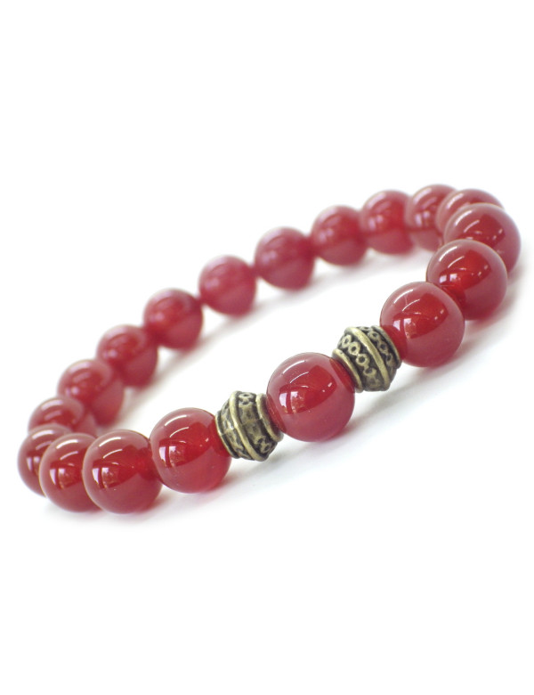 Pulsera de mujer muy bonita hecha con mimo en nuestros talleres de Francia. Esta pulsera está hecha de hermosas cuentas de cornalina roja natural y cuentas tibetanas muy bonitas en latón bronce antiguo. Es la fuerza del metal lo que brilla en este modelo. Estilo: Étnico, Bohemio, tribal, Zen Longitud: 190 mm Cuentas: 10 mm Materiales: cornalina roja (piedra semipreciosa), latón Color: rojo, Color del metal: Bronce antiguo