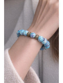Pulsera de mujer muy bonita hecha con mimo en nuestros talleres de Francia. Esta pulsera está hecha de hermosas cuentas de jade blanco natural teñidas de azul y morado y cuentas tibetanas muy bonitas en latón bronce antiguo. Es la fuerza del metal lo que brilla en este modelo. Estilo: Étnico, Bohemio, Tribal, Zen Longitud: 190 mm Cuentas: 10 mm Materiales: Hematita (piedra semipreciosa), Latón Color: Azul, Púrpura, Blanco, Metal Color: Bronce antiguo Magnífica pulsera compuesta por cuentas de jade blanco natural teñidas en azul y morado (piedra semipreciosa) y cuentas de latón tibetano, todas montadas en un hilo elástico de calidad. Esta pieza de joyería viene con una bolsa de regalo de color dorado gratis.