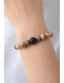 Pulsera de mujer muy bonita hecha con mimo en nuestros talleres de Francia. Esta pulsera está hecha de hermosas cuentas de jaspe marrón natural, cuentas de ágata negra y cuentas tibetanas muy bonitas en latón bronce antiguo. Es la fuerza del metal lo que brilla en este modelo. Estilo: Étnico, Bohemio, tribal, Zen Longitud: 190 mm Cuentas: 10 mm Materiales: jaspe (piedra semipreciosa), latón ágata negra Color: marrón, negro Color del metal: Bronce antiguo Magnífica pulsera compuesta por cuentas de jaspe marrón natural (piedra semipreciosa), ágata negra y cuentas de latón tibetano, todo ello montado en un hilo elástico de calidad. Esta pieza de joyería viene con una bolsa de regalo de color dorado gratis.