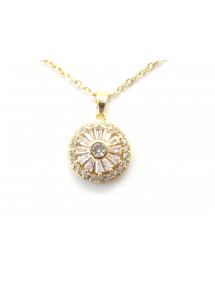 Este refinado collar evoca el resplandor del sol con su colgante redondo de 15 mm, adornado con una circonita central rodeada de radiantes baguettes y un círculo de piedras brillantes. Elaborado en acero inoxidable chapado en oro, está montado sobre una cadena de 45 cm con una extensión de 5 cm para un ajuste perfecto. Elaborada artesanalmente en nuestro taller de Anjou, esta joya encarna la luz y la feminidad, ideal para realzar tus looks en cualquier ocasión.