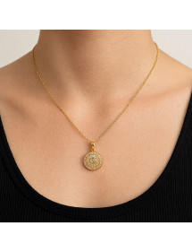 Este refinado collar evoca el resplandor del sol con su colgante redondo de 15 mm, adornado con una circonita central rodeada de radiantes baguettes y un círculo de piedras brillantes. Elaborado en acero inoxidable chapado en oro, está montado sobre una cadena de 45 cm con una extensión de 5 cm para un ajuste perfecto. Elaborada artesanalmente en nuestro taller de Anjou, esta joya encarna la luz y la feminidad, ideal para realzar tus looks en cualquier ocasión. Collar de acero inoxidable chapado en oro. Largo de cadena: 45 cm + 5 cm de extensión. Colgante redondo de 15 mm, engastado con una circonita central, baguettes radiantes y pavé circular. Cierre de mosquetón. Artesanía francesa, elaborado en nuestro taller de Anjou.