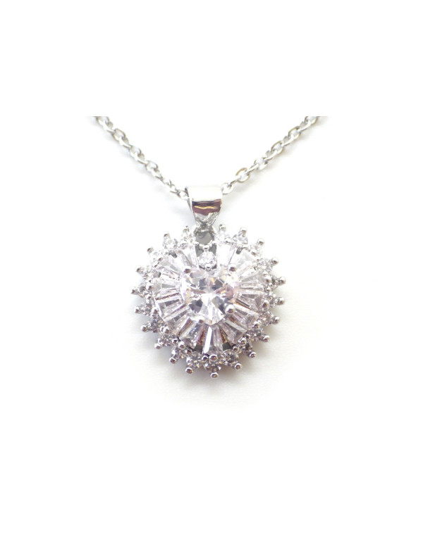 Símbolo de amor y elegancia, este collar se distingue por su colgante de corazón de 18 mm, realzado por una circonita central en forma de corazón rodeada de baguettes y piedras brillantes. Fabricado en acero inoxidable bañado en plata, está montado en una cadena de 45 cm con una extensión de 5 cm, para un ajuste cómodo y ajustable. Elaborado artesanalmente en nuestro taller de Anjou, esta romántica joya iluminará tus atuendos con brillo y refinamiento.