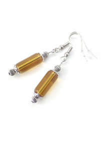 Pendientes de cristal marrón claro y latón plateado – Ganchos de acero inoxidable – Hechos a mano