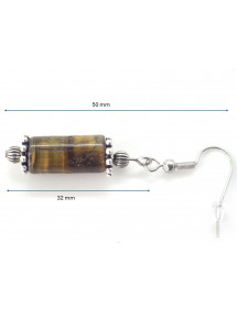 Estos pendientes de ojo de tigre cautivan con sus brillantes reflejos marrones y dorados, auténticos destellos de luz natural. El ojo de tigre, piedra protectora por excelencia, es conocido por alejar las energías negativas, fortalecer la confianza en uno mismo y promover la claridad mental. Sus cálidos tonos evocan fuerza, determinación y conexión con la tierra. Cada colgante cilíndrico de 30 mm está tallado a partir de un ojo de tigre natural cuidadosamente pulido, revelando su magnífica iridiscencia dorada. Las cuentas y los accesorios de latón plateado añaden un toque de brillo, contrastando a la perfección con la piedra. Los ganchos y pasadores de acero inoxidable garantizan un ajuste cómodo, duradero e hipoalergénico. Estos pendientes, elaborados artesanalmente en nuestro taller de Anjou, combinan elegancia y energía protectora. Combinan a la perfección con un atuendo sencillo o con un look natural o étnico chic. Cada par se presenta en una bolsita natural, lista para regalar o para darse un capricho. Materiales: Colgante de ojo de tigre natural, cuentas y fornituras de latón bañado en plata, ganchos y pasadores de acero inoxidable. Altura total: 50 mm Altura del colgante: 30 mm Origen de la piedra: Sudáfrica e India, yacimientos reconocidos por sus brillantes reflejos dorados. Hecho a mano en Francia, en nuestro taller de Anjou.