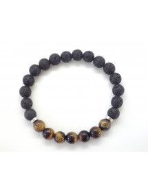 Esta pulsera está compuesta por cuentas naturales de 8 mm, que alternan siete cuentas de ojo de tigre dorado y cuentas de piedra volcánica negra, separadas por dos discos de acero inoxidable.