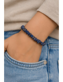 Esta pulsera, hecha con auténticos fragmentos de lapislázuli, cautiva con su profundo tono azul con toques dorados. Hecha íntegramente con piedras naturales, no contiene piezas metálicas, lo que proporciona una comodidad óptima para pieles sensibles. Flexible y ligera, se adapta fácilmente a la mayoría de las muñecas gracias a su engaste elástico. Cada piedra, única en su forma y tono, confiere a esta pieza artesanal un auténtico encanto mineral. Hecha a mano en nuestro taller de Anjou, esta pulsera expresa toda la belleza natural del lapislázuli, una piedra que simboliza la sabiduría y la serenidad. Esta pulsera está hecha de fragmentos pulidos de lapislázuli natural, montados sobre un resistente cordón elástico. Mide 19 cm de largo y está diseñada sin piezas metálicas, lo que la hace ideal para quienes buscan joyería hipoalergénica. El lapislázuli se distingue por su intenso color azul, realzado por ligeras inclusiones de pirita dorada. Cada pulsera se elabora a mano en nuestro taller de Anjou, con artesanía francesa que garantiza su autenticidad y calidad.