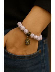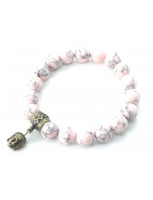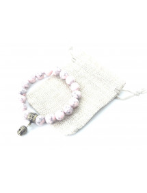 Esta pulsera está hecha con cuentas de turquesa reconstituida de 10 mm teñidas de rosa, ensartadas a mano en un resistente cordón elástico, y presenta una cabeza de Buda de latón con acabado bronce antiguo. Su longitud de 19 cm se adapta a la muñeca estándar de una mujer. Cada pieza se elabora artesanalmente en Francia, en nuestro taller de Anjou, con especial atención a los materiales y acabados. Esta joya se distingue por su suave y elegante tono rosa, que le aporta un toque femenino y refinado.