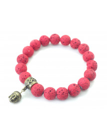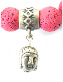 Esta pulsera cuenta con cuentas de piedra volcánica teñidas de rojo de 10 mm, ensartadas a mano en un cordón elástico resistente, y presenta una cabeza de Buda de latón con acabado bronce antiguo. Su longitud de 19 cm se ajusta a la muñeca estándar de una mujer. Cada pieza está hecha a mano en Francia.