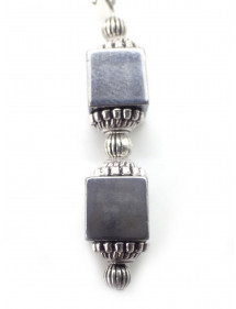 Los pendientes miden 75 mm de largo en total y 40 mm en la sección de cuentas. Están compuestos por cuentas cuadradas de hematita cromada, una piedra natural densa y brillante extraída principalmente en Brasil y apreciada por su intenso brillo metálico. Los topes de las cuentas son de latón plateado y los aros, alargados, finos y resistentes, son de acero inoxidable. Cada par está hecho a mano en nuestro taller de Anjou, Francia.