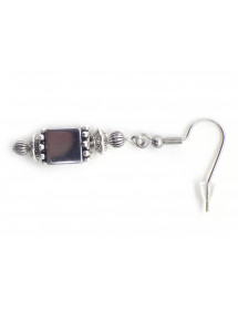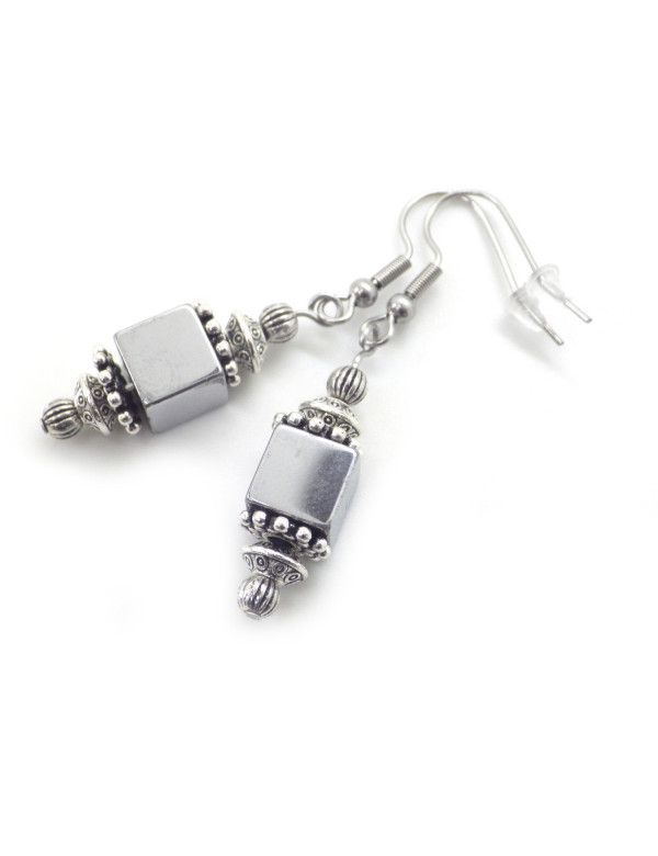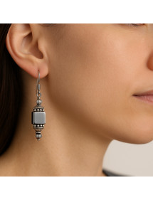 Los pendientes miden 45 mm de largo en total y 25 mm en la parte de cuentas. Están compuestos por cuentas cuadradas de hematita cromada, una piedra natural conocida por su brillo metálico y su densidad característica. La hematita procede principalmente de Brasil y se distingue por sus profundos reflejos plateados. Los delicados remates calados de latón plateado enmarcan la piedra para realzar su brillo. Los ganchos y postes son de acero inoxidable, lo que garantiza comodidad y durabilidad. Los pendientes están elaborados artesanalmente en nuestro taller de Anjou, Francia.
