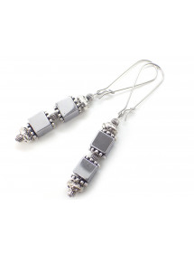 Estos pendientes se distinguen por su elegante verticalidad y el profundo brillo de la hematita natural. Compuestos por dos cubos pulidos separados por copas de plata calada, ofrecen un sutil y refinado juego de luces. Los ganchos alargados de acero inoxidable realzan su estilo moderno y estilizan el rostro. Cada par está elaborado artesanalmente en nuestro taller de Anjou, símbolo de la tradición artesanal francesa. Una joya gráfica y atemporal, ideal para complementar cualquier atuendo.