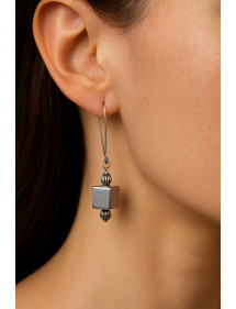 Estos elegantes pendientes lucen un cubo de hematita natural, una piedra semipreciosa con un sutil brillo metálico. Su diseño geométrico se alarga delicadamente gracias a unos finos ganchos de acero inoxidable plateado, creando un efecto moderno y refinado. La combinación de metal plateado y hematita refleja un equilibrio perfecto entre fuerza y elegancia. Cada par está elaborado artesanalmente en nuestro taller de Anjou, lo que garantiza un acabado impecable y duradero.