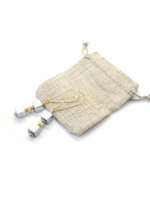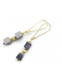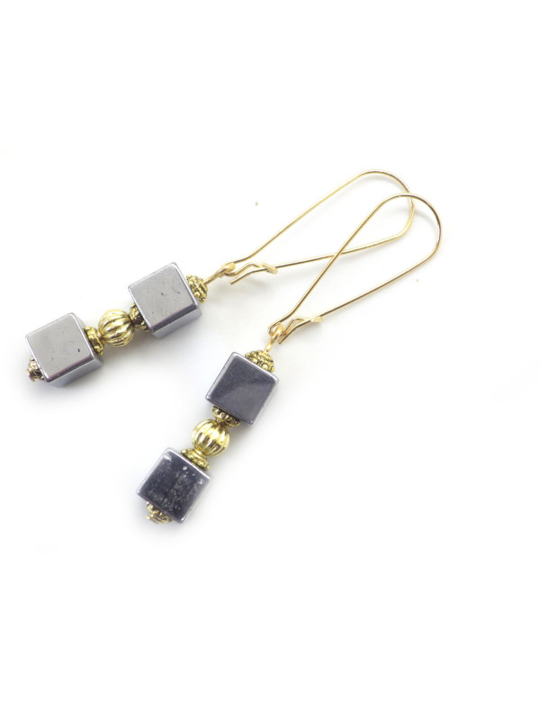 Estos pendientes combinan la fuerza metálica de la hematita natural con el cálido brillo del oro. Cubos de hematita, una piedra semipreciosa de color gris acero, se combinan con cuentas y vástagos de latón chapado en oro, suspendidos de largos aros de acero inoxidable chapado en oro de 18 quilates. Una joya elegante y luminosa, elaborada artesanalmente en nuestro taller de Anjou, perfecta para realzar un atuendo chic o contemporáneo.