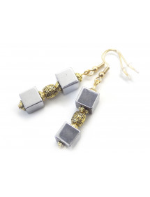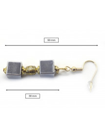 Estos elegantes pendientes combinan la fuerza mineral de la hematita natural con el brillo del oro. Los dos cubos de hematita, separados por una cuenta de latón chapada en oro grabada, crean una composición equilibrada y refinada. Los ganchos chapados en oro de 18 quilates garantizan comodidad y durabilidad, además de aportar un toque de luminosidad. Cada par está elaborado artesanalmente en nuestro taller de Anjou, utilizando técnicas tradicionales francesas.