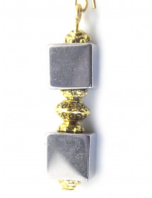 Estos luminosos pendientes combinan la elegancia del oro con la fuerza mineral de la hematita natural. Cada pieza presenta dos cubos de hematita de Brasil, enmarcados por delicadas copas caladas de latón chapado en oro. Los aros cerrados chapados en oro de 18 quilates garantizan un ajuste seguro y un aspecto refinado. Un diseño chic y atemporal, elaborado artesanalmente en nuestro taller de Anjou.
