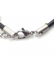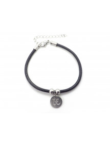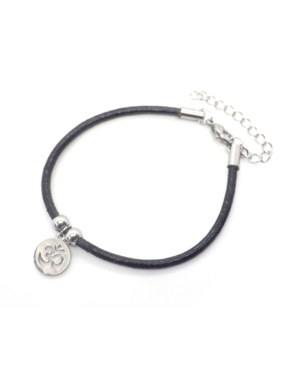 Pulsera de mujer en cuero negro con colgante Ohm en acero inoxidable.