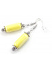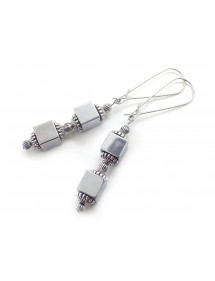 Estos pendientes artesanales combinan dos cuentas cuadradas de hematita cromada con delicadas copas de latón plateado, ofreciendo un refinado contraste entre el brillo metálico y el relieve texturizado. Su diseño alargado estiliza la figura, mientras que los finos aros de acero inoxidable aportan ligereza y elegancia. Con 70 mm de longitud total, fusionan el estilo contemporáneo con la artesanía, lo que los hace ideales para complementar un atuendo elegante o informal. Cada par está hecho a mano en nuestro taller de Anjou, Francia.