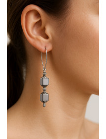 Estos pendientes combinan elegancia y minimalismo gracias a dos cubos de hematita natural con profundos reflejos metálicos. Su diseño alargado de 60 mm estiliza la figura y captura la luz con sutileza. Los ganchos alargados de acero inoxidable aportan un toque contemporáneo y garantizan una sujeción excelente. Las pequeñas cuentas metálicas estriadas realzan el carácter gráfico y equilibrado de la pieza. Elaborados completamente a mano en nuestro taller de Anjou, estos pendientes encarnan la artesanía francesa, fusionando modernidad y autenticidad.