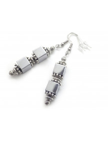 Estos elegantes pendientes lucen un cubo de hematita natural, una piedra semipreciosa con un sutil brillo metálico. Su diseño geométrico se alarga delicadamente gracias a unos finos ganchos de acero inoxidable plateado, creando un efecto moderno y refinado. La combinación de metal plateado y hematita refleja un equilibrio perfecto entre fuerza y ​​elegancia. Cada par está elaborado artesanalmente en nuestro taller de Anjou, lo que garantiza un acabado impecable y duradero.