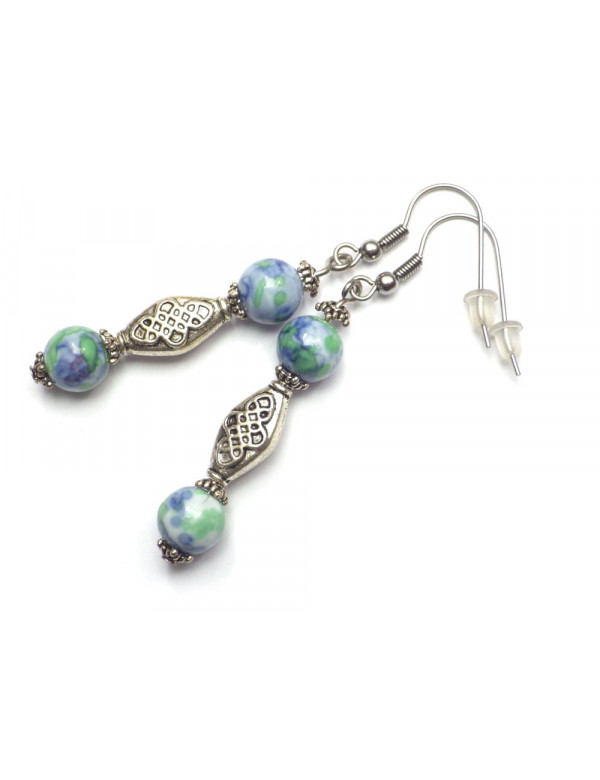 Pendientes étnicos zen con perlas de jade reconstituidas azules y verdes y perlas tibetanas