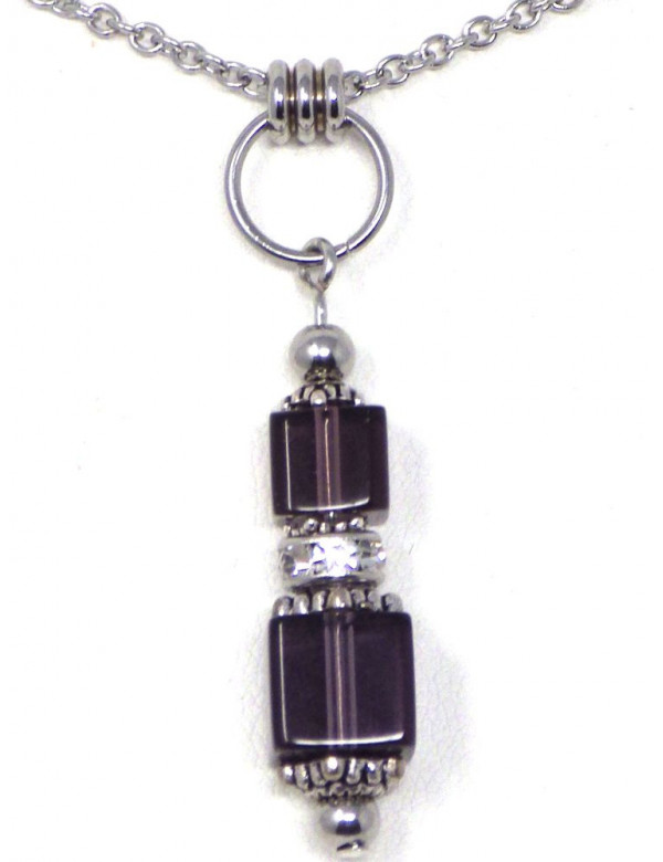 Precioso collar de acero inoxidable morado de estilo clásico para mujer elegante. Esta preciosa joya está hecha con cuentas cuadradas de vidrio morado. La cadena, el cierre y todas las partes metálicas están hechas de acero inoxidable con la excepción del clavo y las copas colgantes que están hechas de latón plateado. El color dominante del colgante es el morado. Esta joya está adornada con una magnífica perla de acero inoxidable con diamantes de imitación, las perlas de vidrio son de 6 y 8 mm. La longitud del collar es de 46 cm. Thurcolas es un taller de creación francés especializado en la fabricación artesanal de joyas. Todas nuestras joyas, pulseras, aretes, collares y cadena de tobillo están hechos a mano en Francia con materiales de calidad. Este collar está hecho con materiales de calidad, el cierre de langosta, la cadena y todas las partes metálicas son de acero inoxidable, solo las copas y las varillas son de latón plateado._x000D_