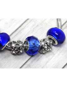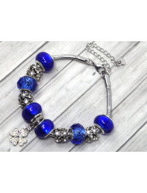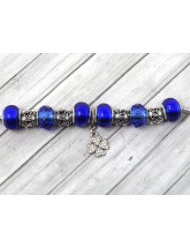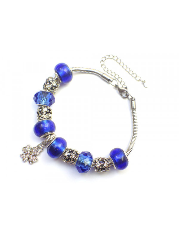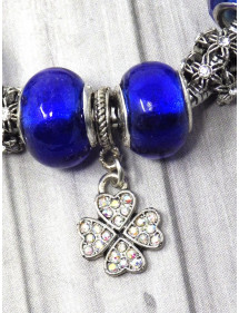 Preciosa pulsera de acero inoxidable. Hecha con pasión esta pulsera Manhattan Charms está compuesta de cuentas de metal plateado con cristales y cuentas de vidrio azul. Las cuentas de esta pulsera son compatibles con pulseras y collares estilo Charms. El conjunto está montado en una cadena de eslabones de serpiente de acero inoxidable y adornado con un magnífico colgante en forma de trébol con cristales. Estilo: Charms Longitud: 190 mm Colgante: 25 mm Cierre: pinza de langosta Cuentas: de 9 a 14 mm con orificio grande compatible con pulseras estilo Charms Materiales: Acero inoxidable, latón, resina, vidrio, cristales Color: Azul, azul marino Color del metal: plata antigua