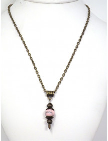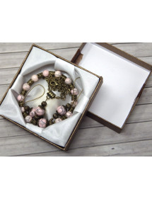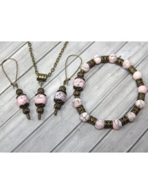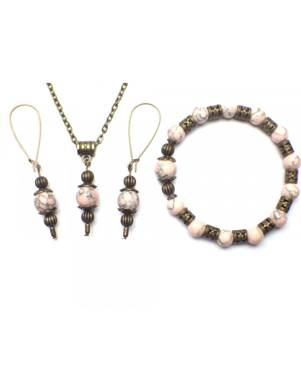 Magnífica pulsera, pendientes y collar vintage engastados en bronce antiguo. Hecho a mano, este conjunto de joyas que consta de una pulsera, pendientes de aro y un collar está elaborado con mimo y compuesto de turquesa reconstituida rosa y bronce antiguo. Todo está montado sobre un elástico resistente de calidad, aros elegantes y una cadena de bronce antiguo. Estilo: Bohemia, Pendientes de crochet vintage: criolla Altura de los pendientes: 60 mm Longitud de la pulsera: 19 cm Longitud de la cadena: 43 cm Cuentas: turquesa reconstituida rosa Materiales: bronce antiguo Color: rosa Color del metal: Bronce antiguo