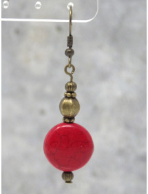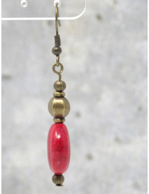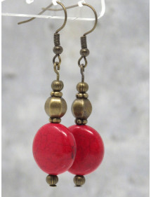 Superbes boucles d'oreilles pendantes Hippie Chic fabriquées artisanalement en France avec des perles rouges en turquoise reconstituée, et avec des perles tibétaines en bronze. L'ensemble est très chic, vous allez les adorer. Le tout est monté sur des crochets French en bronze. Style : Bohême, boho, gypsy, tribal, ethnique, Zen Crochet : French en bronze Hauteur : 50 mm Perles : turquoise reconstituée (16x6 mm), perles tibétaines en bronze Matériaux : Turquoise reconstituée, bronze, laiton Couleur : Rouge Couleur du métal : Bronze