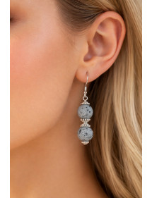 Boucles d'oreilles en perles de pierre de lave grise et perles tibétaines