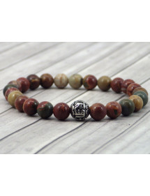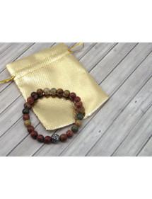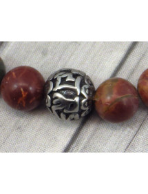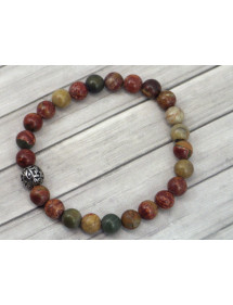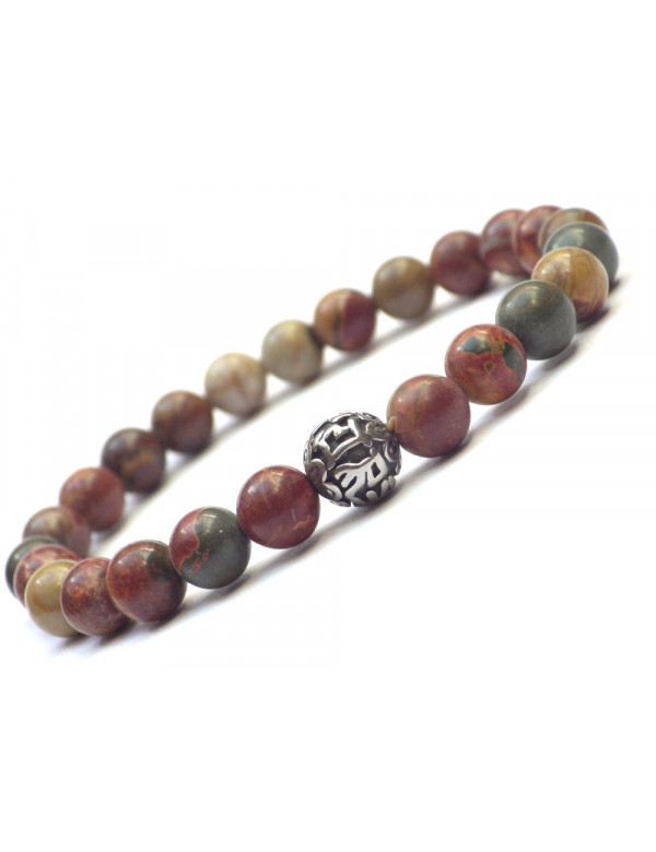 Magnifique bracelet de la gamme Africa Dream réalisé avec soin dans nos ateliers en France. Ce bracelet est fabriqué en avec des perles naturelles jaspe Picasso (pierre semi-précieuse) et une très belle perle centrale en acier inoxydable avec motifs chinois. L'ensemble est monté sur un fil élastique de qualité. Style : Ethnique, tribal, bohème, hippie chic Longueur : 210 mm Perles : 8 mm Matériaux : jaspe Picasso (pierre semi-précieuse), acier inoxydable Couleur : Marron, rouge, vert Couleur du métal : Acier