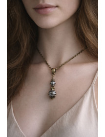 Son style vintage, sublimé par de magnifique perles, le rend idéal pour une occasion spéciale ou pour apporter une note chic à votre tenue quotidienne. Ce collier ainsi que son fermoir sont en laiton bronze antique, assortis à des perles et tiges en laiton, pour un design harmonieux et intemporel. Parfaitement équilibré avec une chaine de 45 cm et un pendentif de 35 mm.