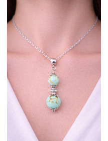 Magnifique création artisanale présentée par ThurColas Création, il s'agit d'un collier en acier inoxydable avec un pendentif constitué de perles de turquoise reconstituée avec de la résine et teintées en bleu, agrémenté de perles tibétaines et coupelles en laiton argenté.
