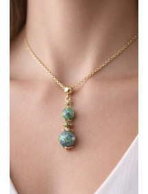 Magnifique création artisanale présentée par ThurColas Création, il s'agit d'un collier en acier inoxydable plaqué or avec un pendentif constitué de perles naturelles en jade blanc teinté vert et noir (pierre semi précieuse) agrémenté de perles tibétaines et coupelles en laiton doré. Son style vintage, sublimé par de magnifique perles, le rend idéal pour une occasion spéciale ou pour apporter une note chic à votre tenue quotidienne. Ce collier ainsi que son fermoir sont en acier inoxydable plaqué or, assortis à des perles et tiges en laiton doré, pour un design harmonieux et intemporel. Parfaitement équilibré avec une chaine de 45 cm et un pendentif de 35 mm. Style : Classique, chic, Ethnique, Bohême Hauteur pendentif : 35 mm Longueur collier : 45 cm Perles : 10 mm et 8 mm Matériaux : jade blanc teinté noir et vert (pierre semi précieuse), laiton, acier inoxydable Couleur : noir, vert Couleur du métal : doré, or Nos perles utilisées pour le pendentif de ce collier sont en jade blanc teinté noir et vert véritable et assemblées sur une tige en laiton doré le tout est monté sur une chaîne en acier inoxydable plaqué or, le jade étant une pierre naturelle, chaque perle est unique en couleur il peut donc y avoir de légères différences avec le modèle présenté, chaque modèle est de fait unique. Ce bijou est livré avec une pochette cadeau gratuite. Ce bijou est le fruit d’un savoir-faire artisanal français. Entièrement fabriqué à la main dans mon atelier, il reflète l’attention portée aux détails et la passion pour la création de pièces uniques et élégantes. Un véritable gage de qualité et d’authenticité. Longueur de la chaîne : 45 cm Hauteur du pendentif : 35 mm Perle : 10 et 8 mm Chaîne et fermoir : acier inoxydable Fabrication artisanale française