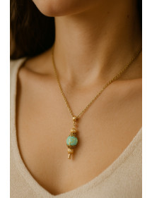 Superbe création artisanale présentée par ThurColas Création, il s'agit d'un ensemble de bijoux composé de boucles d'oreille et d'un collier en acier inoxydable plaqué or avec pendentifs constitués de perles de turquoise reconstituée avec de la résine et teintées en rose, agrémenté de perles tibétaines et coupelles en laiton doré. Parfaitement équilibrées avec une hauteur totale de 50 mm et un pendentif de 35 mm, ces boucles d’oreilles légères et confortables sont pensées pour être à la fois élégantes et faciles à porter. Chaque collier est composé d'une chaîne de 45 cm et d'un fermoir mousqueton en acier inoxydable plaqué or, assorti d'un pendentif de 35 mm composé d'une tige et de perles en laiton doré ainsi que de deux perles de 10 et 8 mm. Style : Classique, chic, Ethnique, Bohême Hauteur pendentif : 35 mm Longueur collier : 45 cm Hauteur Boucles d'oreille : 50 mm Crochets : French Perles : 10 mm et 8mm Matériaux : Turquoise reconsituée rose, laiton doré, acier inoxydable plaqué or Couleur : rose Couleur du métal : or,doré Nos perles utilisées pour les pendentifs de cet ensemble de bijoux composé d'un collier et d'une paire de boucles d'oreille sont en turquoise reconstituée et assemblées sur une tige en laiton doré le tout est monté sur une chaîne et des crochets en acier inoxydable plaqué or, la turquoise reconstituée étant teintée et marbrée de façon aléatoire, chaque perle est unique en couleur il peut donc y avoir de légères différences avec le modèle présenté, chaque modèle est de fait unique. Ce bijou est livré avec une pochette cadeau gratuite. Hauteur totale des boucles d'oreille : 50 mm Longueur du collier : 45 cm Hauteur du pendentif : 35 mm Perle : 10 et 8 mm Crochets, fermoir et chaîne : acier inoxydable plaqué or Tiges et perles métalliques : Laiton doré Fabrication artisanale française