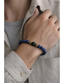 Très beau bracelet pour homme fabriqué avec soin dans nos ateliers en France. Ce bracelet est composé de magnifiques perles naturelles en lapis lazuli, de perles d'Agate noire et de très jolies perles tibétaines en laiton couleur bronze antique. C'est la force du métal qui transparaît dans ce modèle. Style : Ethnique, Bohême, tribal, zen Longueur : 210 mm Perles : 10 mm Matériaux : lapis lazuli (pierre semi-précieuse), agate noire laiton Couleur : bleu, noir Couleur du métal : Bronze antique