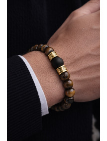 Très beau bracelet pour homme fabriqué avec soin dans nos ateliers en France. Ce bracelet est composé de magnifiques perles naturelles en œil de tigre marron, de perles d'Agate noire et de très jolies perles tibétaines en laiton couleur dorée. C'est la force du métal qui transparaît dans ce modèle. Style : Ethnique, Bohême, tribal, zen Longueur : 210 mm Perles : 10 mm et 12 mm Matériaux : œil de tigre (pierre semi-précieuse), agate noire laiton Couleur : marron, noir Couleur du métal : Doré
