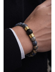 Très beau bracelet pour homme fabriqué avec soin dans nos ateliers en France. Ce bracelet est composé de magnifiques perles naturelles en jaspe impérial bleu, de perles d'Agate noire et de très jolies perles tibétaines en laiton couleur dorée. C'est la force du métal qui transparaît dans ce modèle. Style : Ethnique, Bohême, tribal, zen Longueur : 210 mm Perles : 10 mm et 12 mm Matériaux : jaspe impérial (pierre semi-précieuse), agate noire laiton Couleur : bleu, noir Couleur du métal : Doré