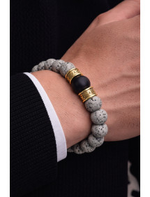 Très beau bracelet pour homme fabriqué avec soin dans nos ateliers en France. Ce bracelet est composé de magnifiques perles naturelles en pierre de lave grise, de perles d'Agate noire et de très jolies perles tibétaines en laiton couleur dorée. C'est la force du métal qui transparaît dans ce modèle. Style : Ethnique, Bohême, tribal, zen Longueur : 210 mm Perles : 10 mm et 12 mm Matériaux : pierre de lave (pierre semi-précieuse), agate noire laiton Couleur : gris, noir Couleur du métal : Doré