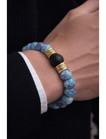Très beau bracelet pour homme fabriqué avec soin dans nos ateliers en France. Ce bracelet est composé de magnifiques perles naturelles en jade blanc teinté en bleu et violet, de perles d'Agate noire et de très jolies perles tibétaines en laiton couleur dorée. C'est la force du métal qui transparaît dans ce modèle. Style : Ethnique, Bohême, tribal, zen Longueur : 210 mm Perles : 10 mm et 12 mm Matériaux : hématite (pierre semi-précieuse), agate noire laiton Couleur : bleu, violet, blanc, noir Couleur du métal : Doré Superbe bracelet composé de perles naturelles en jade blanc teinté en bleu et violet (pierre semi-précieuse) , agate noire et perles tibétaines en laiton doré, le tout est monté sur un fil élastique de qualité. Ce bijou est livré avec une pochette cadeau de couleur dorée gratuite.