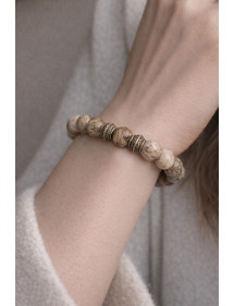 Très beau bracelet pour femme fabriqué avec soin dans nos ateliers en France. Ce bracelet est composé de magnifiques perles naturelles en jaspe marron et de très jolies perles tibétaines en laiton couleur bronze antique. C'est la force du métal qui transparaît dans ce modèle. Style : Ethnique, Bohême, tribal, zen Longueur : 190 mm Perles : 10 mm Matériaux : jaspe (pierre semi-précieuse), laiton Couleur : marron, Couleur du métal : Bronze antique Superbe bracelet composé de perles naturelles en jaspe marron (pierre semi-précieuse) et perles tibétaines en laiton, le tout est monté sur un fil élastique de qualité. Ce bijou est livré avec une pochette cadeau de couleur dorée gratuite.