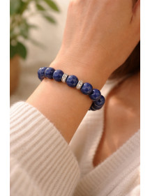 Magnifique création artisanale présentée par ThurColas Création, il s'agit d'un bracelet pour femme constitué de perles naturelles en Lapis Lazuli bleu (pierre semi précieuse) agrémenté de perles en acier inoxydable serties de cristaux. Le tout est monté sur un fil élastique de qualité. Style : Classique, chic, Ethnique, Bohême Longueur : 19 cm Perles : 10 mm Matériaux : Lapis Lazuli bleu (pierre semi précieuse), acier inoxydable, cristal Couleur : bleu Couleur du métal : Argent