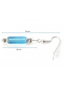 Matériaux : pendentif en verre bleu turquoise, perles métalliques en laiton argenté, crochets et tige en acier inoxydable.