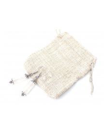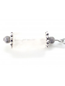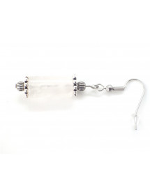 Chaque pendentif cylindrique de 30 mm est façonné dans un quartz blanc naturel soigneusement poli, puis orné de perles et apprêts en laiton argenté délicatement ouvragés.