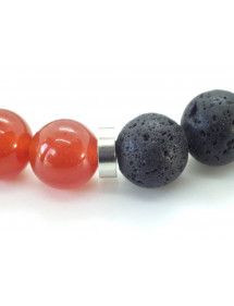 Ce bracelet est composé de perles naturelles de 8 mm alternant sept perles de cornaline rouge orangée et des perles de pierre de lave noire, séparées par deux disques en acier inoxydable.