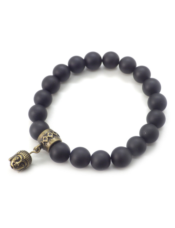 Bracelet en agate noire givrée naturelle du Brésil avec tête de Bouddha en laiton bronze – 10 mm – 19 cm