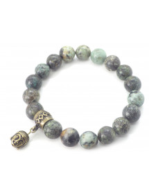 Bracelet en turquoise verte naturelle du Tibet avec tête de Bouddha en laiton bronze – 10 mm – 19 cm