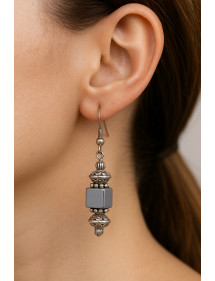 Ces boucles d’oreilles artisanales élégantes associent une perle carrée en hématite chromée à de grandes coupelles ajourées en laiton argenté, créant un bijou lumineux et raffiné. Le contraste entre la brillance métallique de la pierre et les détails ajourés du métal confère un style à la fois moderne et intemporel. D’une longueur totale de 45 mm, elles se portent facilement au quotidien ou pour une occasion spéciale. Chaque paire est soigneusement réalisée à la main dans notre atelier en Anjou, garantissant une finition artisanale de qualité.