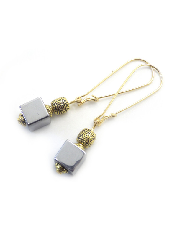 Ces boucles d’oreilles associent la modernité de l’hématite naturelle à l’élégance du doré. Les perles gravées en laiton doré et les créoles allongées plaquées or 18K forment un ensemble harmonieux et raffiné. Leur forme allongée apporte une touche d’élégance et de légèreté, idéale pour sublimer une tenue chic ou habillée. Un bijou artisanal français, conçu avec soin dans notre atelier en Anjou. Ce modèle de boucles d’oreilles mesure 55 mm de long. Il est composé de cubes d’hématite naturelle du Brésil, associés à des perles gravées en laiton doré. Les attaches sont des créoles allongées en acier inoxydable plaqué or 18K, résistantes et hypoallergéniques. Chaque paire est réalisée à la main dans notre atelier d’Anjou, selon un savoir-faire artisanal français.