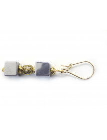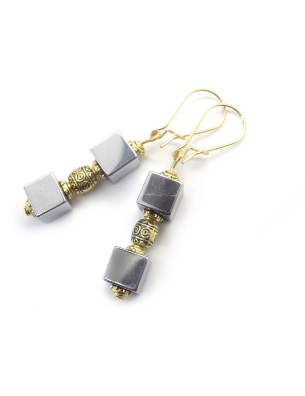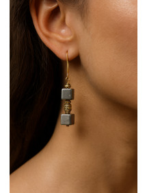 Ces boucles d’oreilles allient la sobriété minérale de l’hématite naturelle à la chaleur du doré. Les deux cubes d’hématite, rehaussés de perles gravées en laiton doré, s’accordent harmonieusement avec les petites créoles plaqué or 18K. Leur éclat élégant et leur finition artisanale en font un bijou raffiné, idéal pour apporter une touche d’élégance à toutes les tenues. Chaque paire est façonnée à la main dans notre atelier en Anjou, selon un savoir-faire artisanal français.